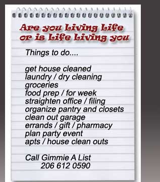 Personal Assistance Kirkland Washington Gimmie a List home services Kirkland is your Dream come true for someone that needs cloning or duplicating. Whether you need a wife in Kirkland, A mother in Kirkland, or just call us a partner. Ladies if you’re a busy mother in Kirkland, well we are there to save you busy Lady. RELAX!!! If you’re a professional and a mother in Kirkland and working right along with your husband OR it’s just you. You’re working so hard in Kirkland to do everything for everyone else with rarely a moment for yourself.